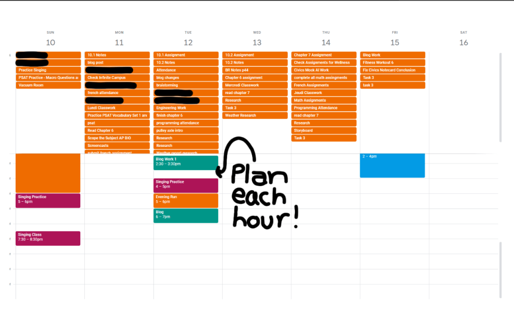 On Monday of each week, I take a look at the agenda for all my classes. I then write down my assignments for the week on Todoist, where I can easily view and check them off without having to worry about missing assignments during the week.